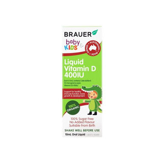 Brauer Baby & Kids Liquid Vitamin D 400IU is a 98.5% organic supplement ideal to help prevent dietary Vitamin D deficiency when sun exposure is inadequate. Vitamin D may help to support a healthy immune system as well as healthy bone development and growth in children and healthy infants ages 6 months and over. 100% sugar free, with no artificial colours or flavours, it's suitable from birth and can be used by the whole family!