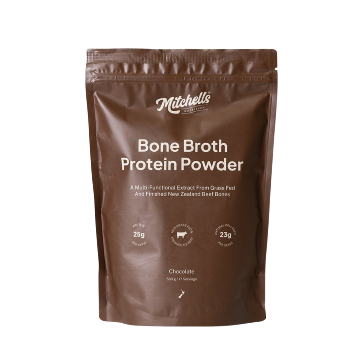 Our best-selling, multi-functional 100% Grass-Fed Bone Broth Protein Powder. Bone broth is the most natural and easily digestible source of protein. Boosted with naturally occurring collagen, think of it as a total body support for joints, bones, muscles, skin, hair, and nails- ideal for any age at any stage.Our Chocolate flavour is gluten-free, dairy-free, contains just 4 natural ingredients and is packed with 25g of protein per serve.