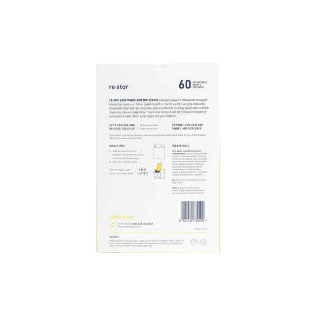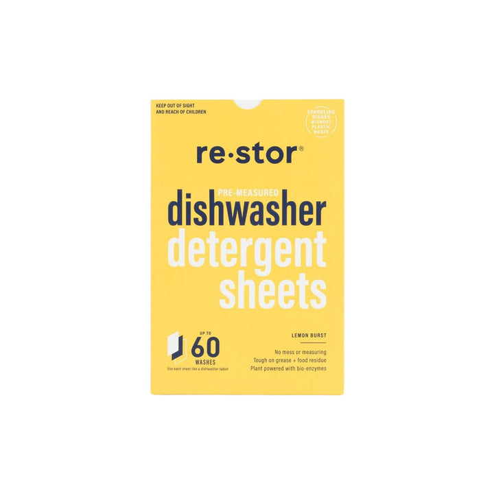 Restor your home and the planet with plant-powered dishwasher detergent sheets that leave your dishes sparkling with no plastic waste. Every pre-measured, dissolvable sheet delivers mess-free, safe and effective cleaning power with no harsh chemicals, dyes or phosphates.