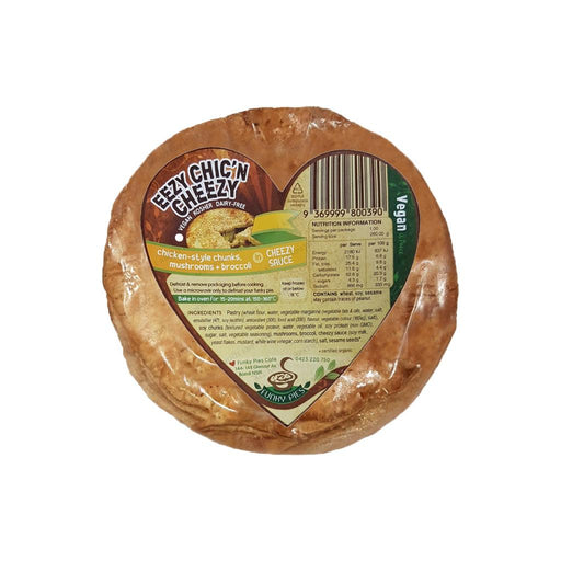 Cheezy Chick*n-style Pie - flaky crust filled with chic'n chunks, mushroom & broccoli in a creamy cheezy sauce.