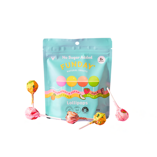 Suck it, sugar! Throwback to the good ol' days with four classic flavours: Strawberry & Cream, Pineapple, Sour Apple, and Cola. Each bag contains 8 lollipops, 2 of each flavour.