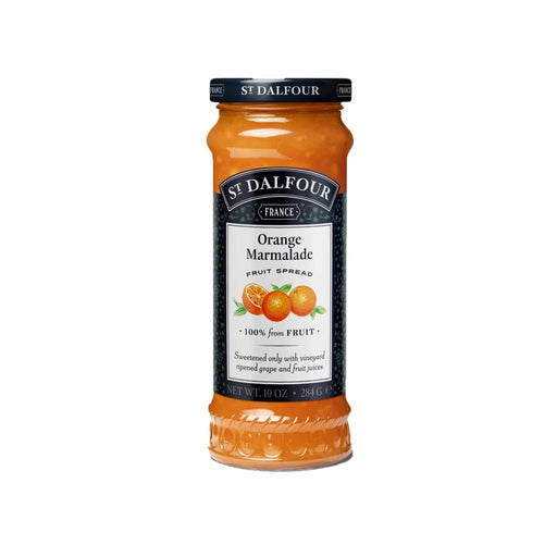 St Dalfour Orange Marmalade Fruit Spread. Hand crafted in France from a traditional family recipe. Traditional orange marmalade with a superb flavour compete with a noticeable tartness. Pairs well with chocolate, gouda and homemade biscuits. 100% from fruit. No cane sugar. No artificial sweeteners. No artificial colours. Sweetened only with vineyard ripened grape and fruit juices. Gluten Free. Vegan.