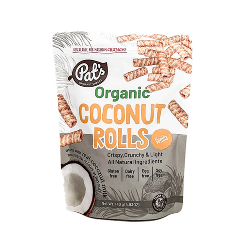 Pat's Organic Coconut Rolls are a light and crispy snack made with real organic coconut milk. While offering you a unique crispy texture, this vegan-friendly snack is rolled using a traditional method avoiding extrusion techniques to preserve the goodness and nutrition for you. Munch on these Coconut Rolls as a crunchy snack, sprinkle as a flaky topping or dip in your morning cup of tea or coffee.