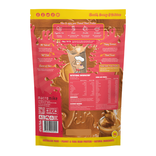 The quest for Macro Mike's perfect protein blend has gone through several variations and this newest Peanut Plant Protein is our best formula yet. We've taken out the rice protein in all our blends and replaced it with a small amount of Faba Bean Protein. This is super high in protein, creamy and rich in texture and also very neutral tasting, it's also grown right here in Australia and is 10 x more carbon neutral than whey protein.