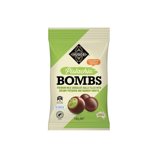 Indulge in the rich fusion of creamy pistachio and crunchy knafeh, wrapped in smooth milk chocolate. Hugo's Pistachio Bombs are a premium treat crafted without artificial colours or flavours. Made in Australia, these bite-sized delights are perfect for sharing or savouring solo.