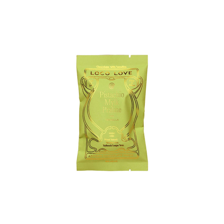 A silky pistachio ganache, dotted with lightly caramelised pistachio pieces. A balance of creamy and crunchy. Sweetened with mineral-rich natural sweeteners and enrobed in our signature mylk chocolate, spiked with beauty mushroom tremella.
