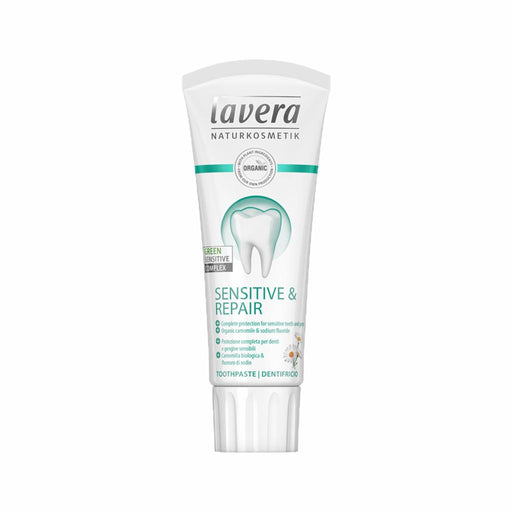 The Lavera Sensitive & Repair Toothpaste with Fluoride provides complete protection for sensitive teeth and gums. It is formulated with Lavera's Green Sensitive Complex which contains Jambú for its anti-inflammatory properties, ensuring a gentle clean for sensitive mouths. This natural toothpaste provides all-round protection against tooth decay, ensures fresher breath and strengthens the dental enamel if used daily.