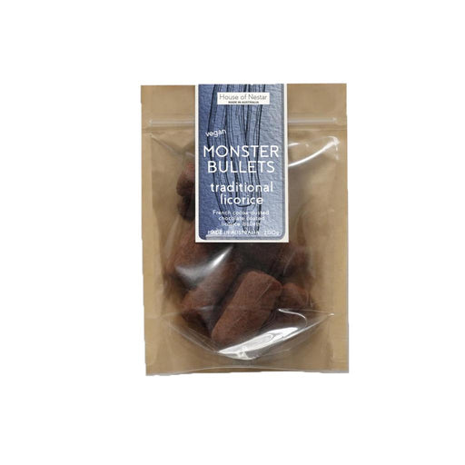 Monster Licorice bullets coated in our premium vegan chocolate, and coated in pure decadent cocoa dust.