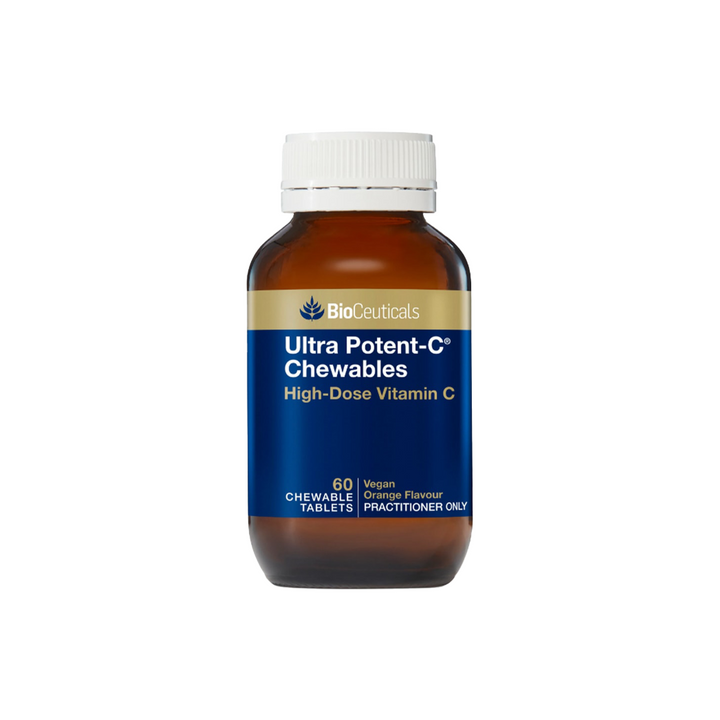 Ultra Potent-C® Chewables provide a high dose vitamin C with supportive nutrients in a delicious orange flavoured vegan chewable tablet. Vitamin C and zinc support a healthy immune system function. Vitamin C assists in maintaining energy levels as well as supporting collagen formation and wound healing. Betacarotene and vitamins C and E are antioxidants and helps reduce free radicals formed in the body.
